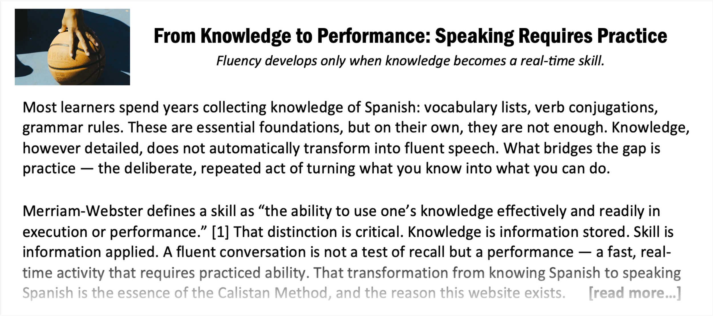 Speaking isn’t just information recall. It’s performance — like music or sports. You don’t master a performance skill by studying it; you master it by practicing it. The full paper explores why practice is the missing step between study and conversation.